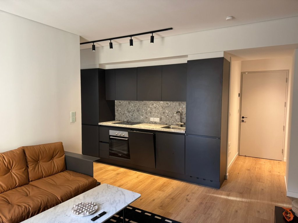 Inside, the apartment boasts a beautifully crafted interior with a modern open-plan kitchen, sleek dark cabinetry, quality appliances, and a stylish stone backsplash. The living area is warm and inviting, complemented by wood-effect flooring and high-quality materials throughout. Large windows bring in natural light, creating a bright and serene atmosphere.