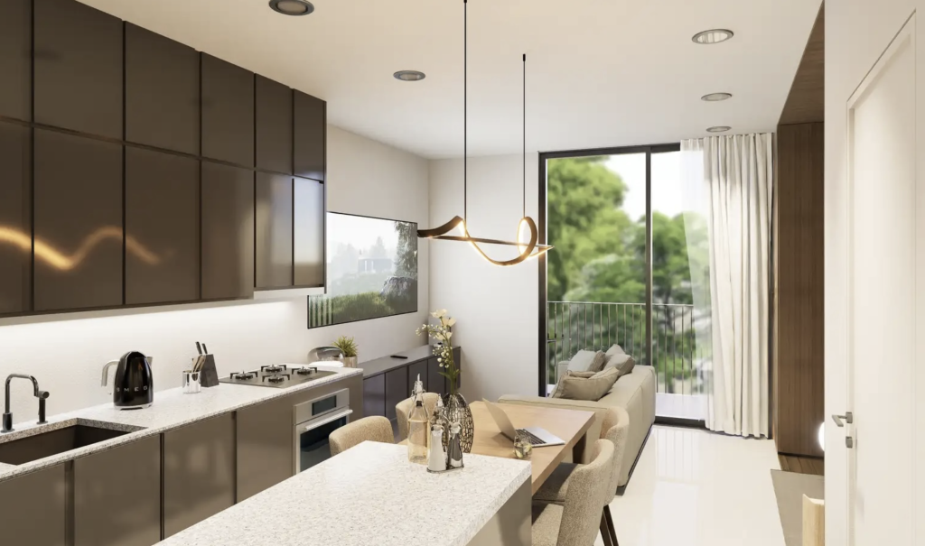 Designed for singles, young professionals, or students, the one-bedroom apartments feature an open-plan living and kitchen area, maximizing functionality in a compact, stylish space. A covered veranda expands the living space outdoors, ideal for relaxing after a busy day.