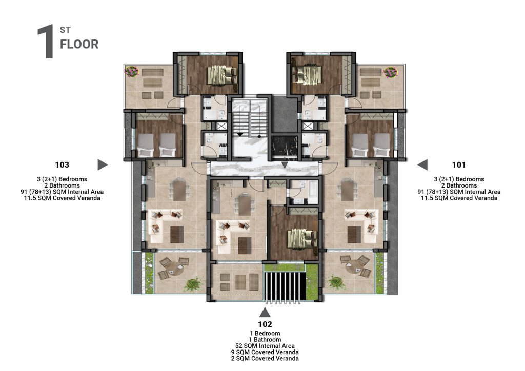 A new project in the area of Aradippou. This luxurious residential project is a 3-floor building composed of spacious 1, 2, 3 and 5 bedroom apartments and penthouse apartments with large terraces.