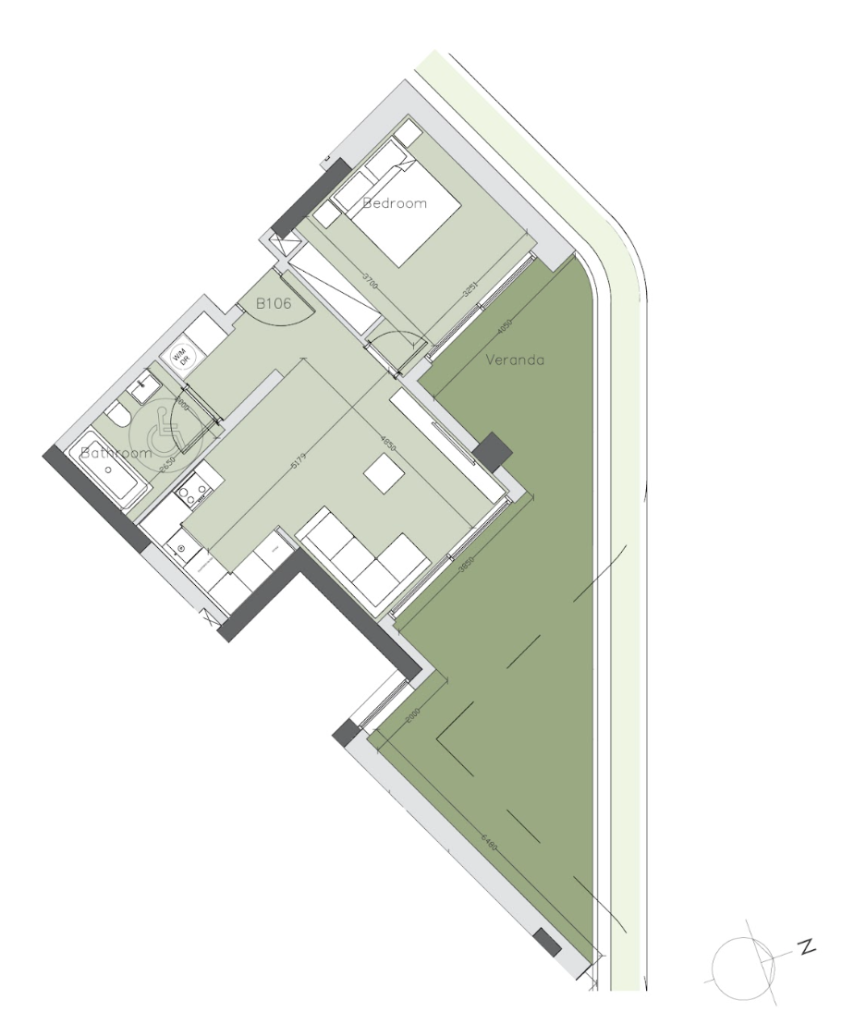 The apartment features a spacious open-plan living area, a modern kitchen with premium European finishes, and a generously sized bedroom. A large veranda enhances indoor-outdoor living while the high ceilings and full-height glazing maximise natural light. Advanced specifications such as underfloor heating, VRV cooling, double glazing, and thermal insulation ensure exceptional comfort.