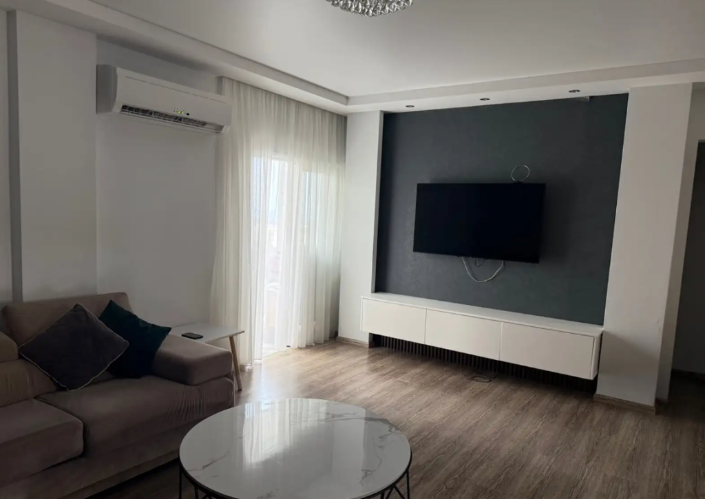 The interior features a bright and airy open-plan layout, furnished in a tasteful and welcoming style. The living and dining area flows seamlessly into a modern, fully equipped kitchen, while large windows allow plenty of natural light and lead to a private balcony—perfect for enjoying your morning coffee or relaxing with sunset views over the hills and sea.