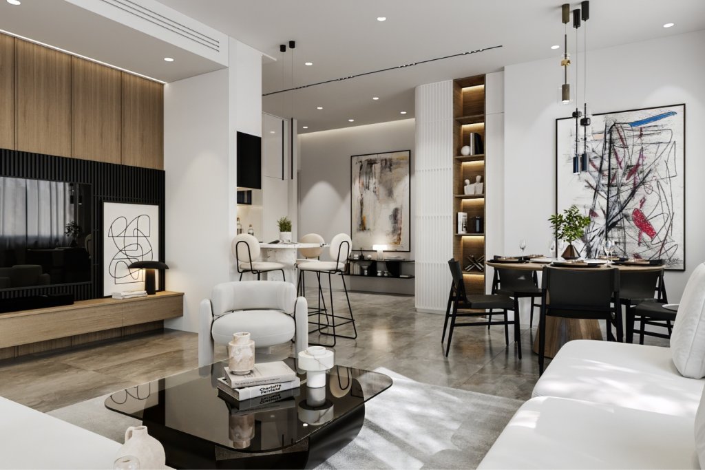The apartment welcomes you with a bright open-plan layout, enhanced by high ceilings and large windows that flood the space with natural light. The spacious living room provides a relaxing setting with modern, comfortable furnishings and connects seamlessly to the dining area—perfect for entertaining or quiet evenings at home.