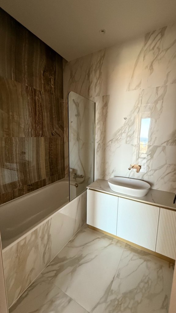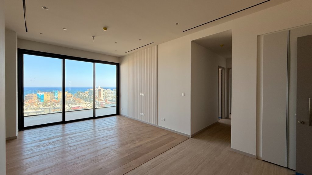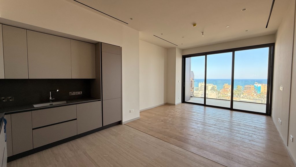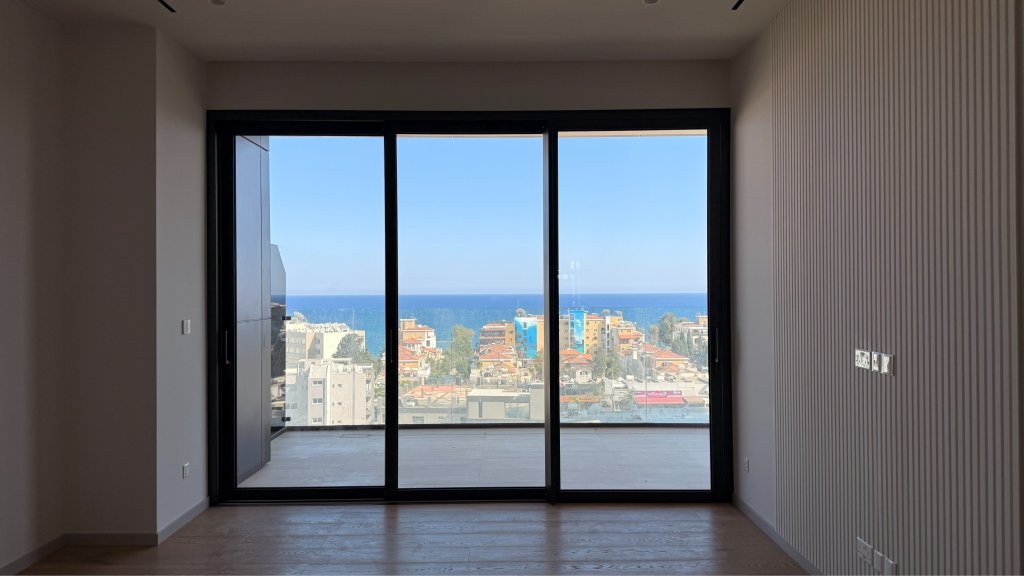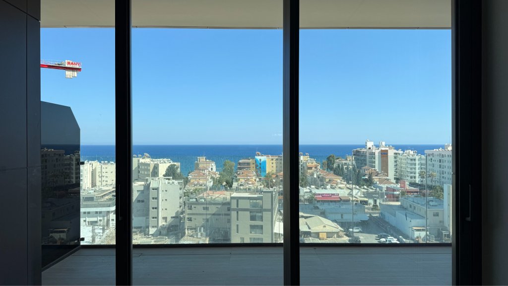The apartment features spacious interiors with an open-plan living area, a sleek modern kitchen, two bedrooms, and two bathrooms. Large windows fill the space with natural light and offer stunning views of the sea, mountains, and city skyline. A private balcony creates the perfect spot for outdoor relaxation while enjoying the panoramic scenery.