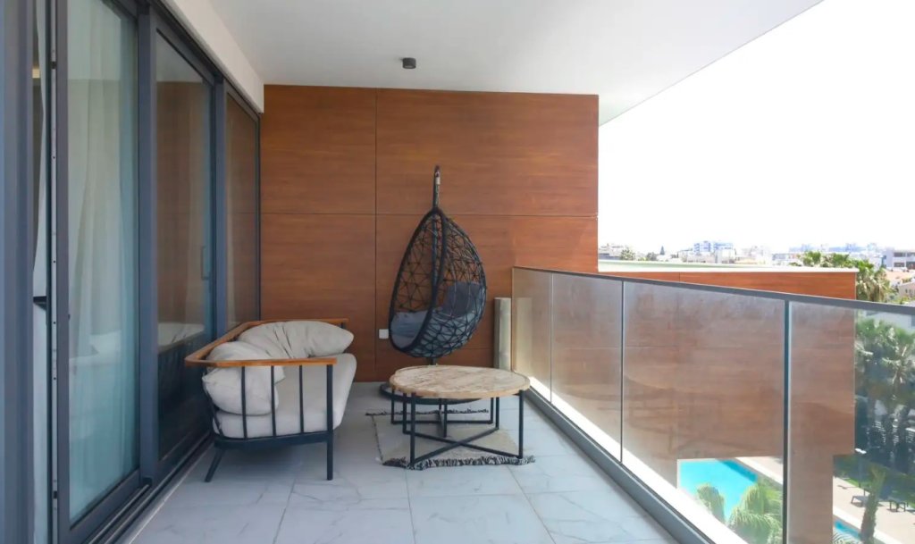 The spacious balcony, finished with warm wood accents and sleek glass panels, is an inviting retreat. Furnished with stylish modern seating and furniture, it provides the ideal spot for morning coffee, evening relaxation, or entertaining with a view of the landscaped gardens and pool.
