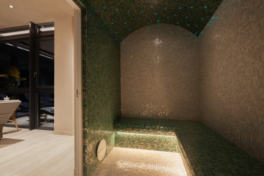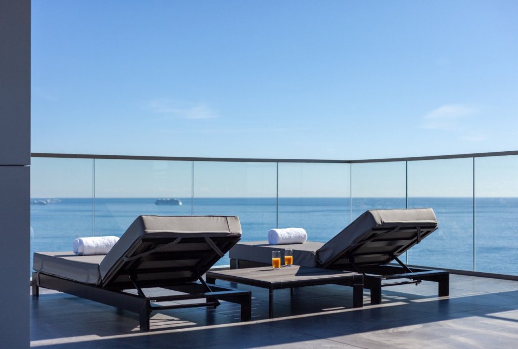 The heart of the home is its open-plan living, dining, and kitchen area, where floor-to-ceiling glass doors bring in natural light and open onto a wide veranda. This outdoor space extends daily living into the Mediterranean climate, creating the ideal setting for dining, entertaining, or simply enjoying the views of the coastline.