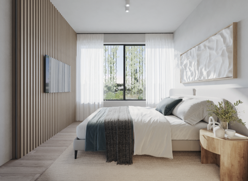 The master suite is a private haven, complete with en-suite bathroom, large built-in wardrobes, and access to the veranda. The second bedroom is versatile, perfectly suited as a child’s room, guest room, or home office. Bathrooms are designed with refined details — ceramic tiles, chrome fittings, and contemporary layouts — ensuring both functionality and style.