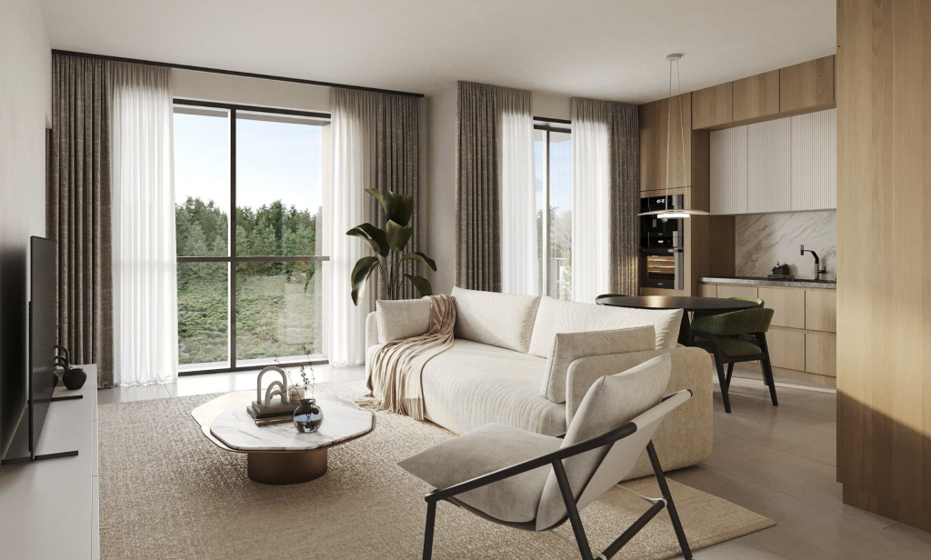 The three-bedroom apartment is designed for those who value space and comfort in the heart of the city. The living area is expansive, with large windows and high ceilings that enhance natural light and openness. It flows directly to a generous balcony or terrace, creating an inviting space for entertaining or relaxing.