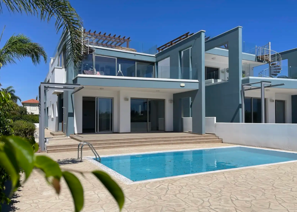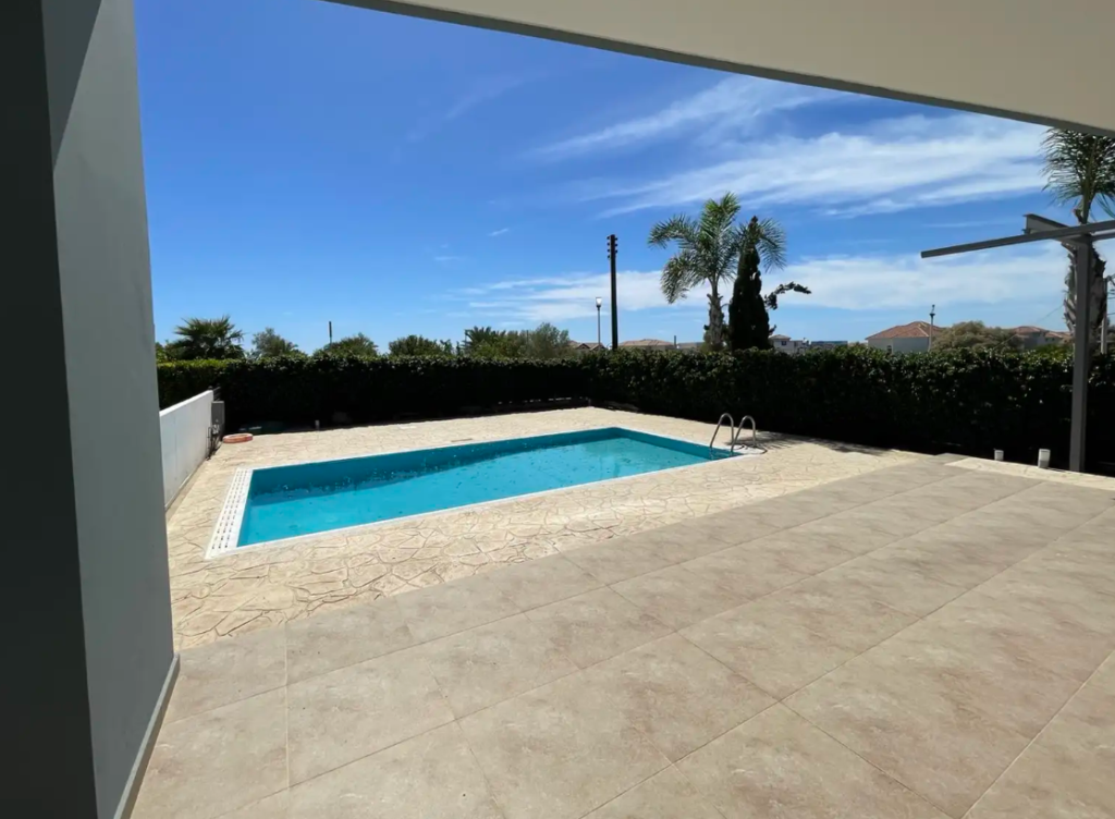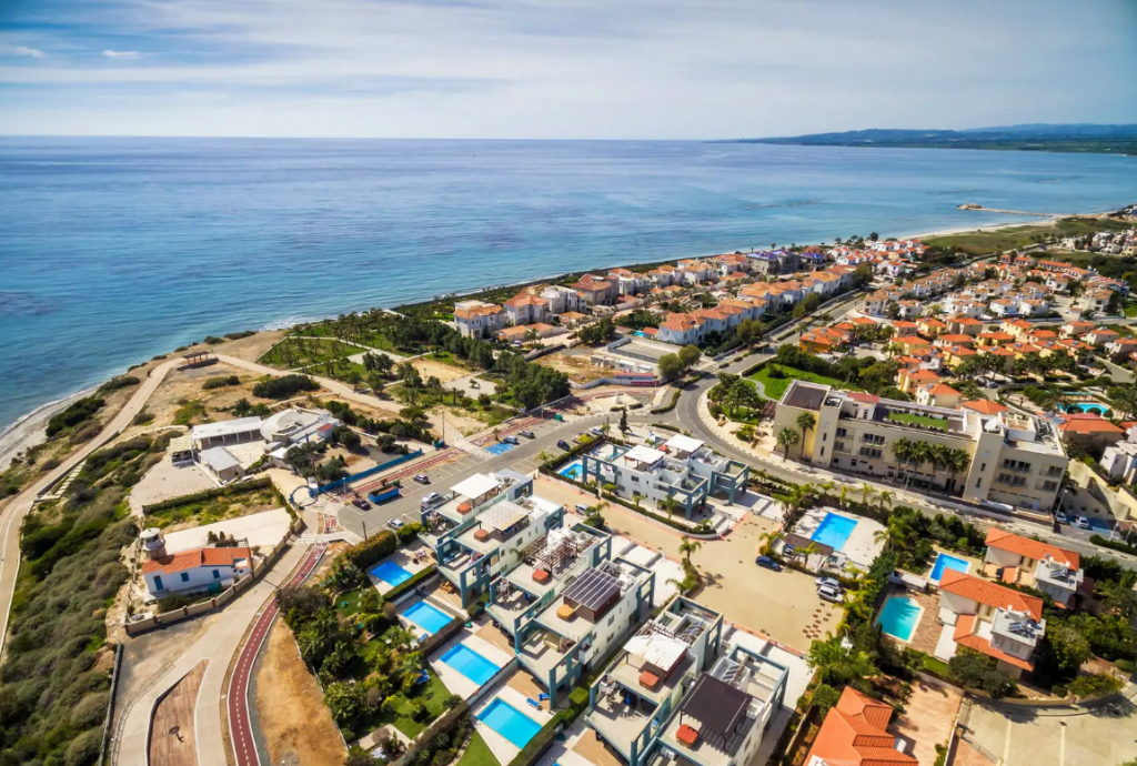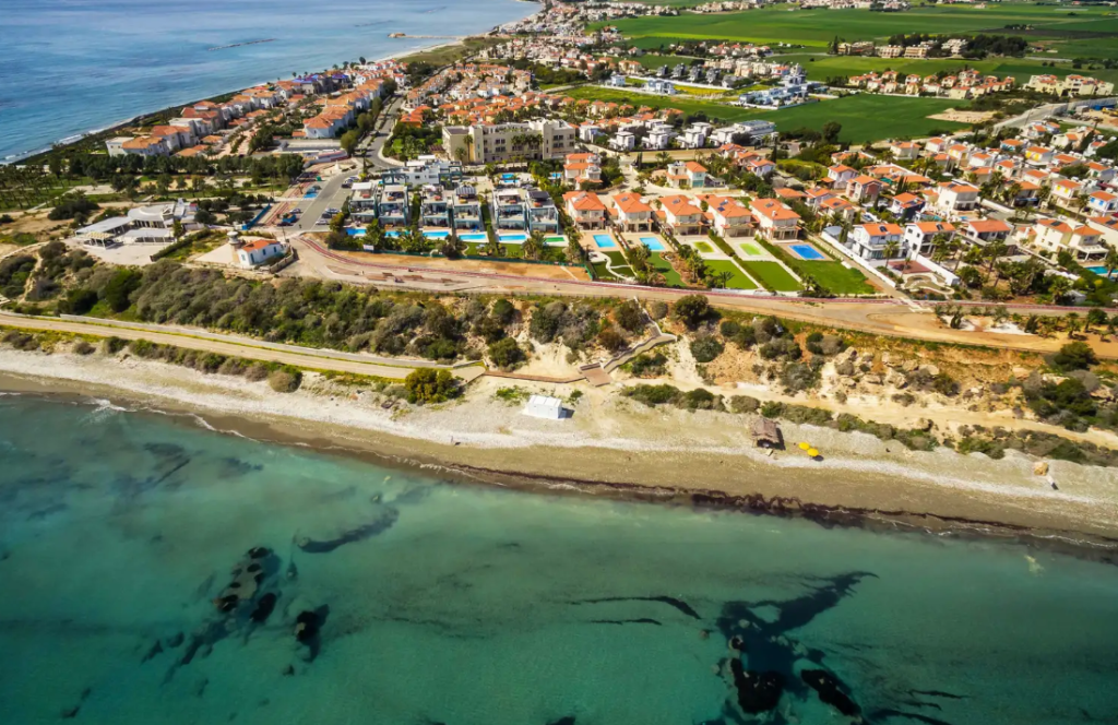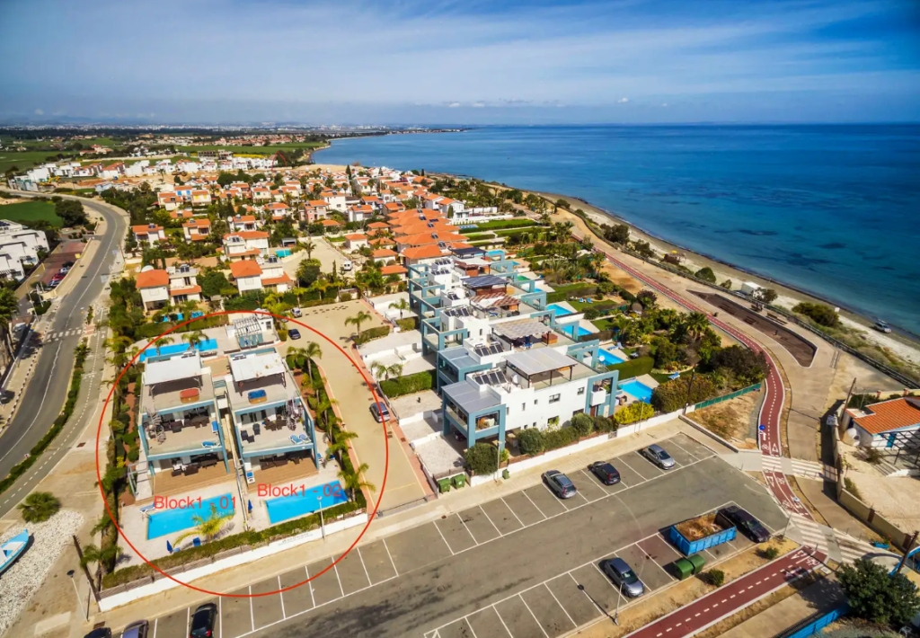 The property is located on cliffs in Pervolia, Larnaca. It boasts a view of the Mediterranean Sea off the Cape Kiti Peninsular and a scenic landscape. The property sits opposite the Faros Lighthouse and is in proximity to the picturesque village centre of Pervollia.