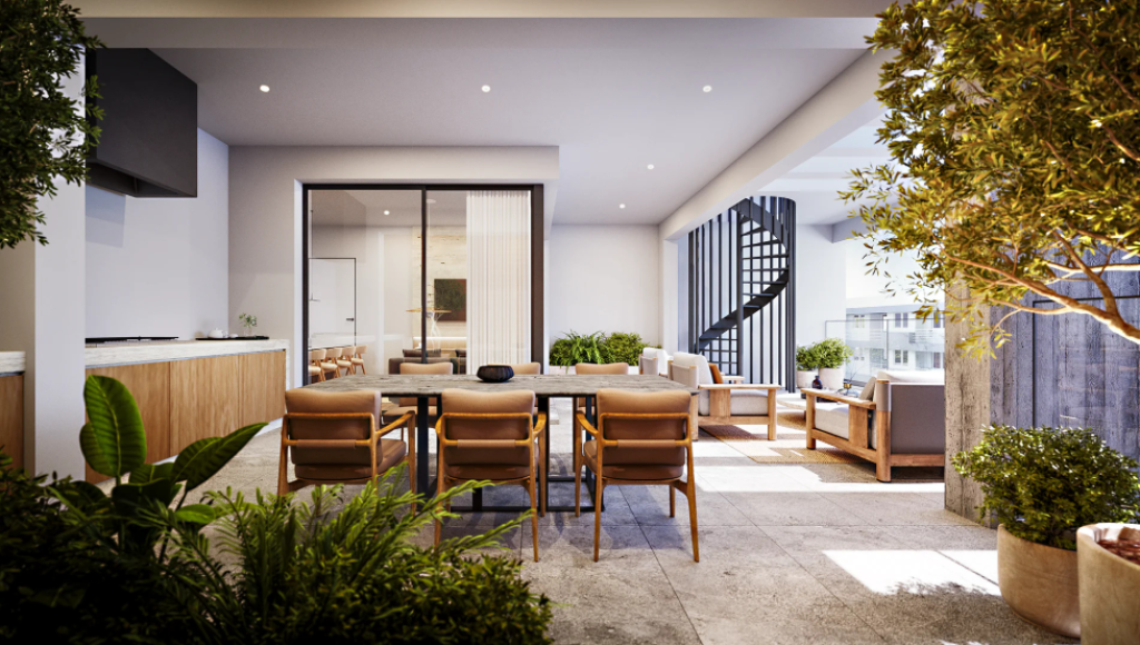 The covered veranda extends the living area outdoors, providing space for al fresco dining, relaxation, or simply enjoying the peaceful city surroundings.