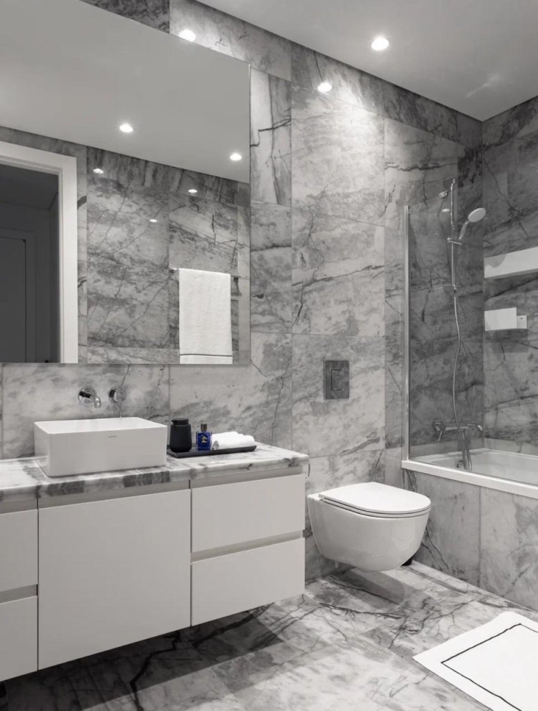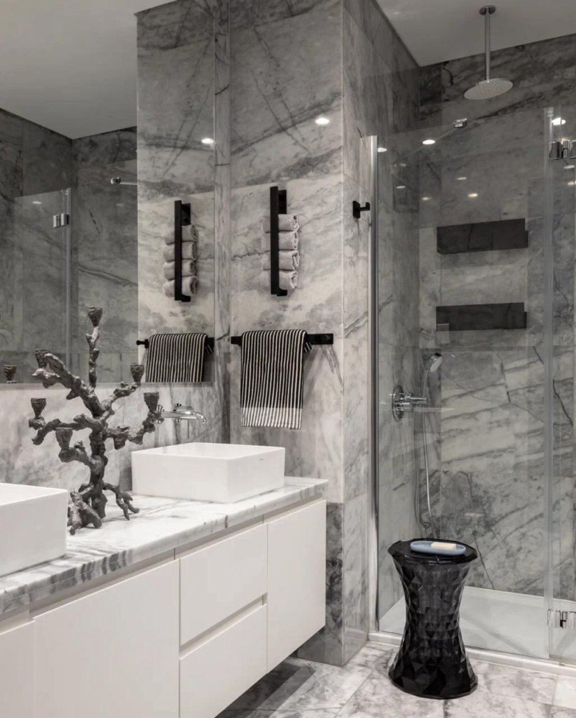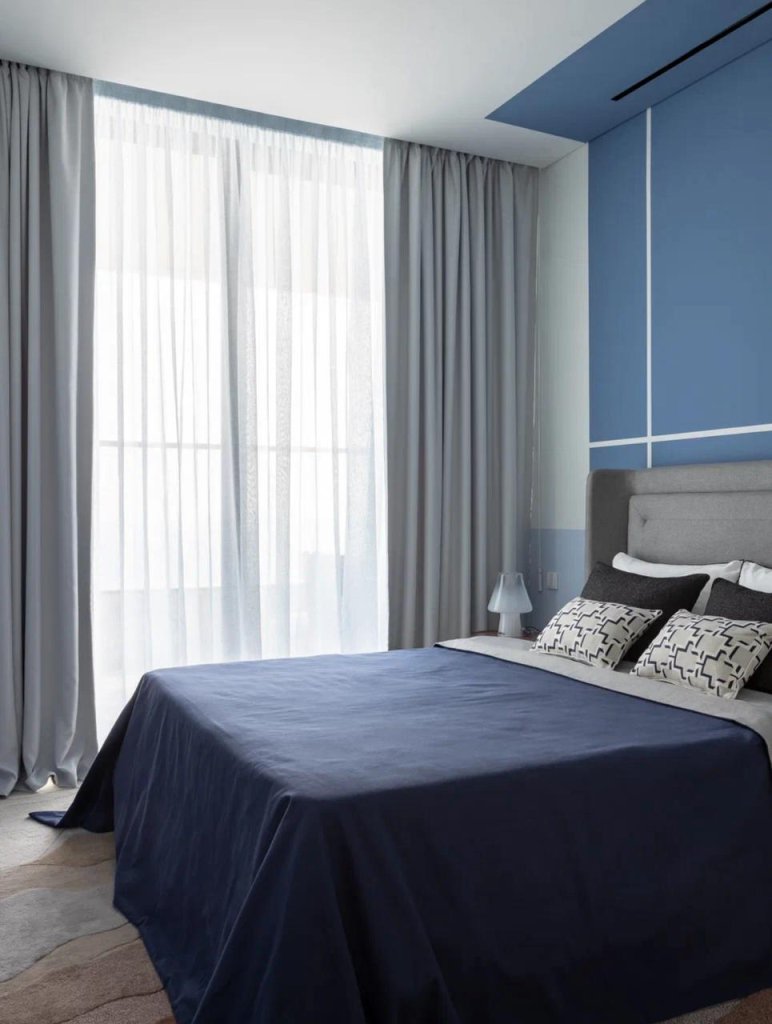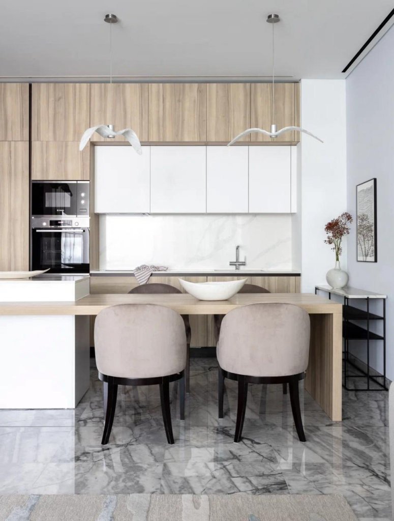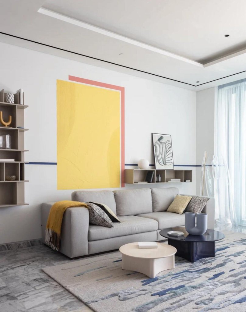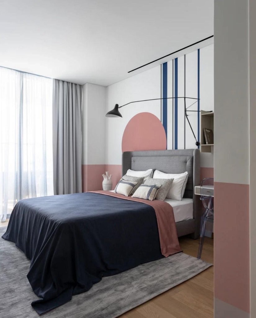 The apartment boasts a unique Bauhaus-inspired design, characterized by its sleek lines, geometric shapes, and minimalist aesthetic.