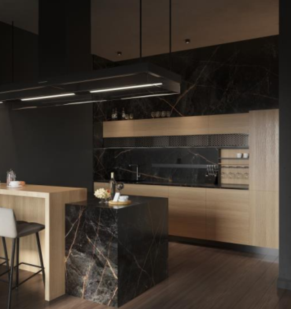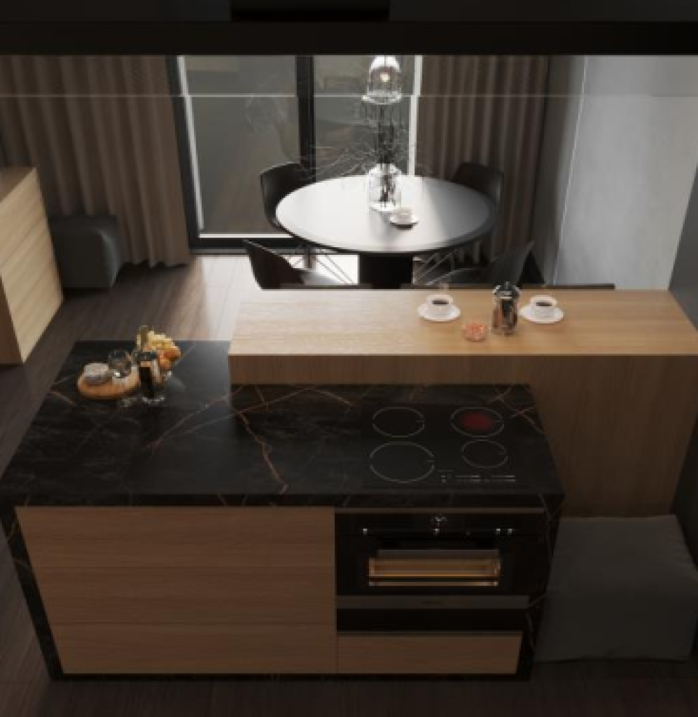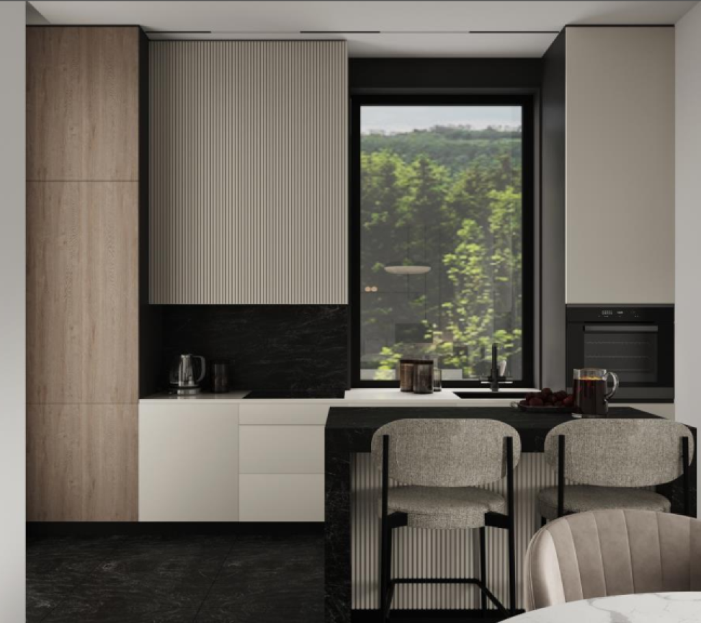 The modern kitchen is fitted with sleek finishes and ample storage, complementing the open-plan configuration.