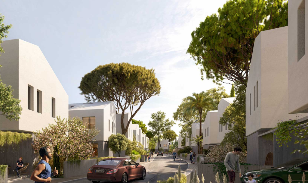 The villa offers an open-plan living and dining space, a modern kitchen, a guest WC on the ground floor, and three well-sized bedrooms upstairs. The master bedroom features an en-suite bathroom, while the other two share a contemporary family bathroom. Outside, each home includes a private terrace and garden area, with access to a large communal swimming pool and landscaped surroundings.