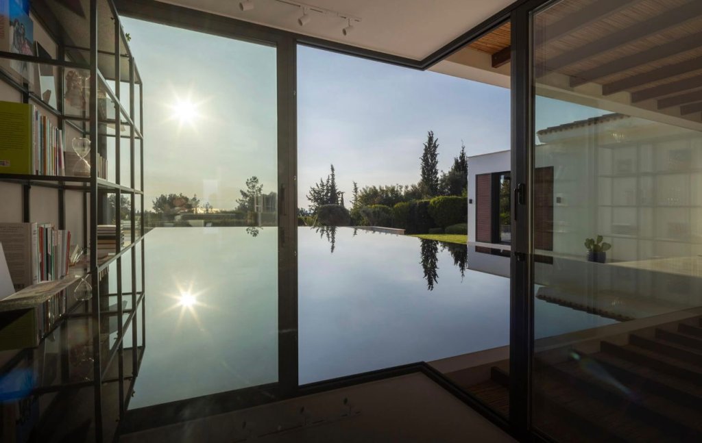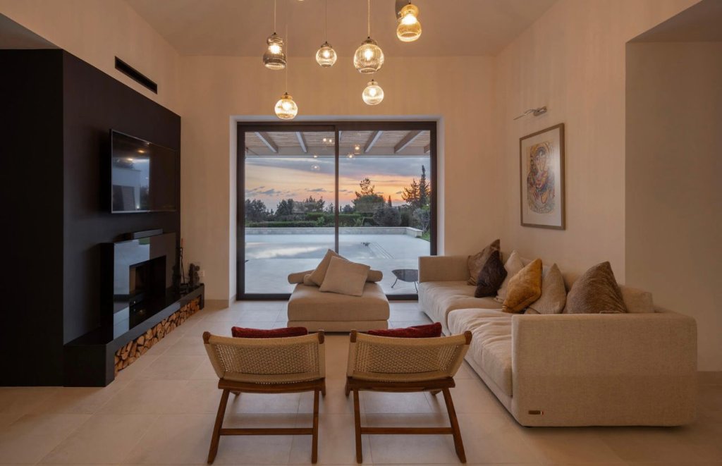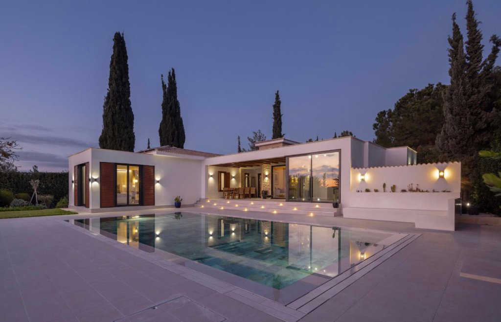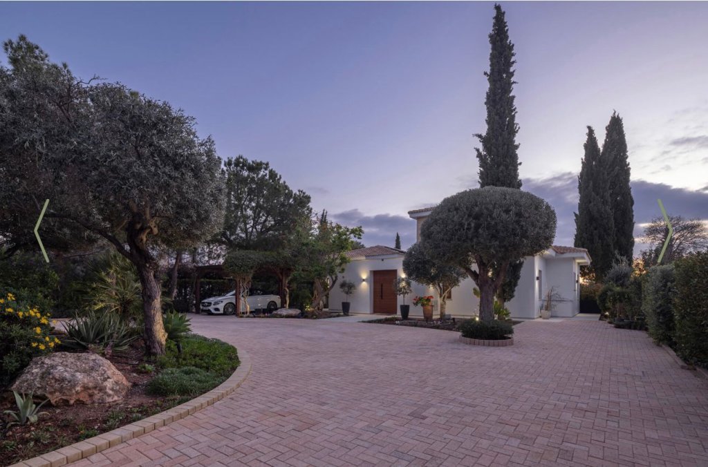 Located in a quiet cul-de-sac on the exclusive Eastern plateau of the Aphrodite Hills Resort, the entire property is surrounded by lush mature gardens with beautiful olive trees, cypresses, pine trees, a fruit garden and tall bay-leaf hedges to ensure complete privacy.