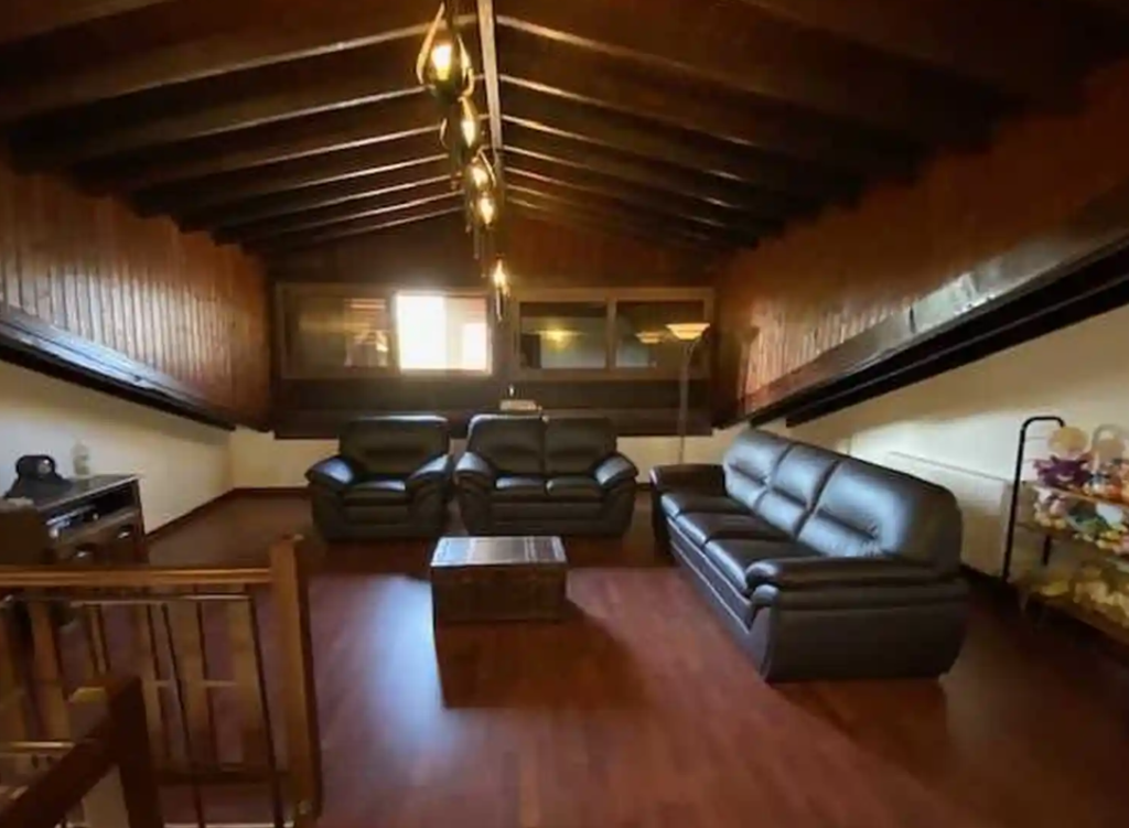 The upper floor features a cosy living room with leather sofas, 2 bedrooms (Master bedroom and bunk bedroom) and the 2nd bathroom. The master bedroom offers a large double bed and beautiful views.
