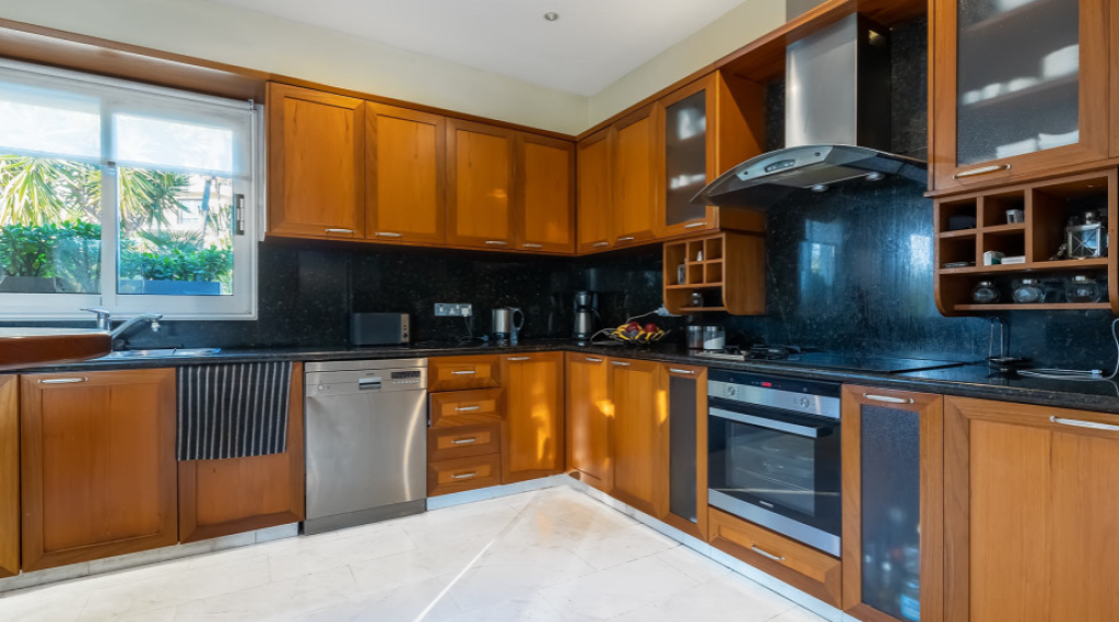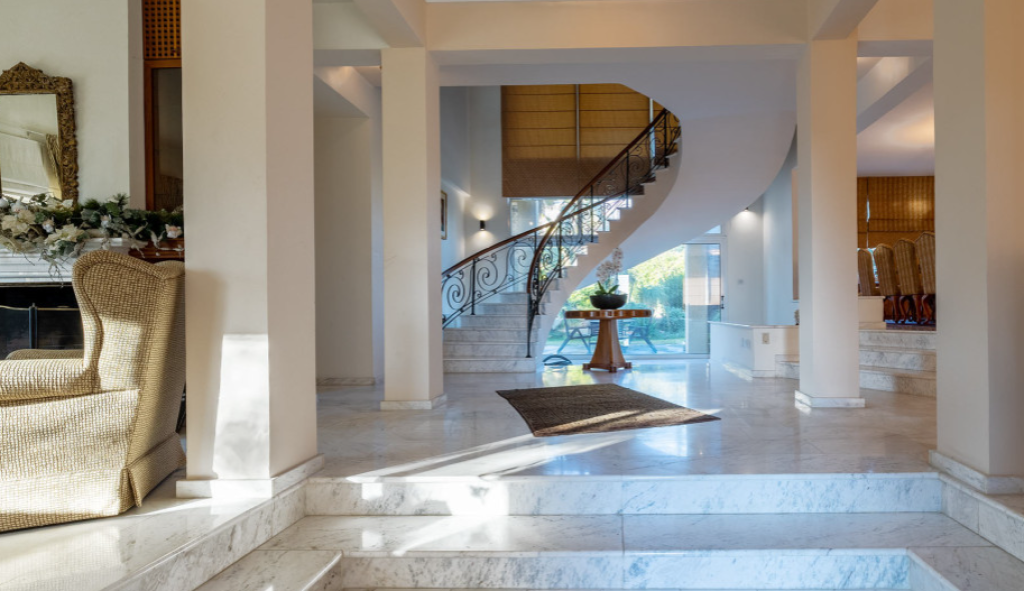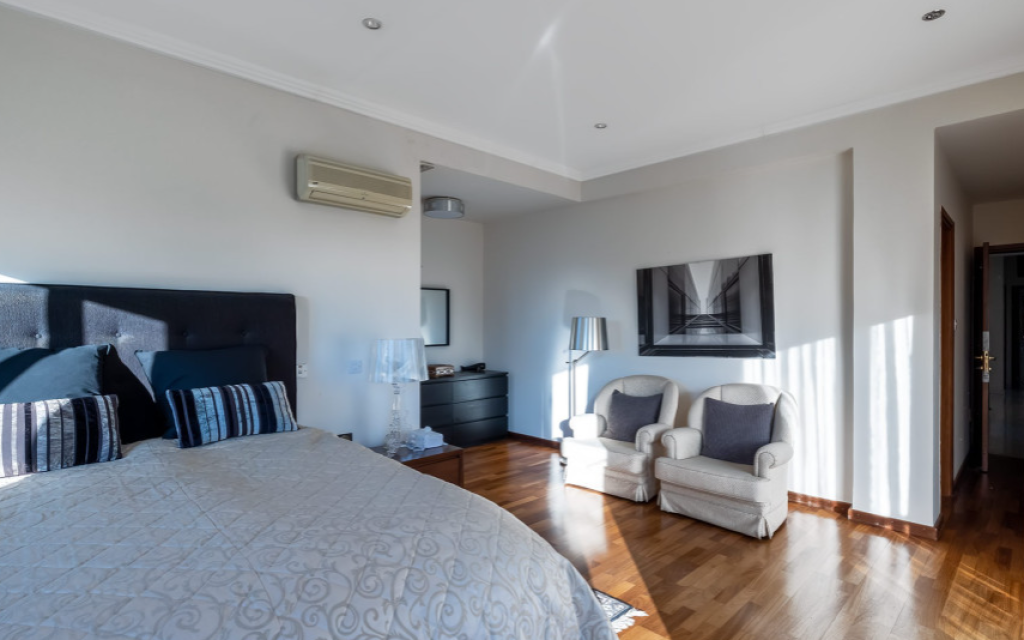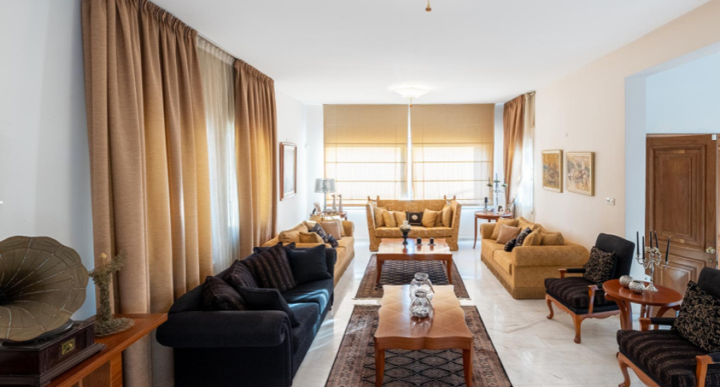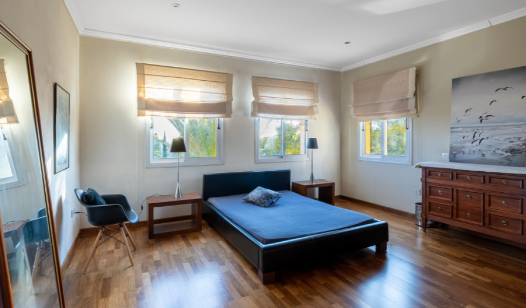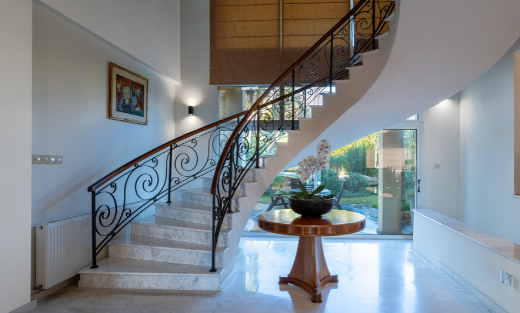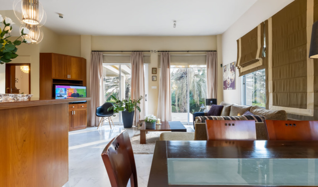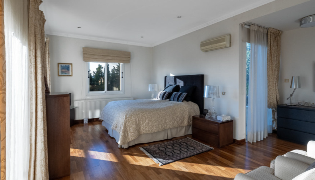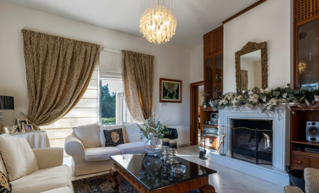 Kalogyri area, one of the most prestigious neighbourhoods of Limassol, is just 2 minutes away from the buzz of the city centre in Germasogeia and a 5 minute’s drive from the sea. This superb 4-bedroom residence sits on a very generous plot of land, with privacy and plenty of greenery around. Entering this spacious and well-designed property, you find yourself on the central lounge with the staircase element as a focal point. There are two sitting areas: the family area with a fireplace, and a formal dining/sitting area. There is a beautiful separate kitchen with access to the pool and BBQ area that has as much space as is needed for Cyprus’ al fresco living that we all cherish. The 80 sq m basement area has a maid’s room with a shower and kitchenette, plus a storage area. There is a lock-up double garage and a comfortable driveway. The first floor has a generously sized master bedroom with a walk-in wardrobe and a bathroom, the three guest bedrooms enjoy plenty of space too. A mature landscaped garden with a natural water well welcomes you outdoors.