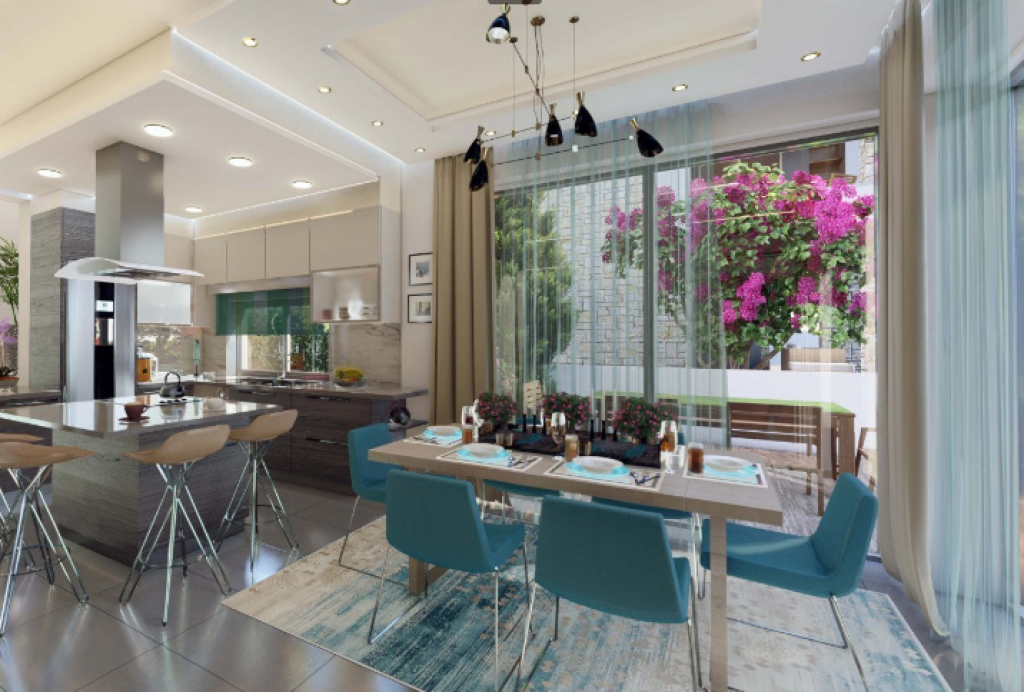 Upon arrival, residents are welcomed by a spacious open-plan layout, where the living, dining, and kitchen areas flow seamlessly together. The L-shaped kitchen features a central island counter, ideal for casual meals or entertaining. Floor-to-ceiling glass doors open directly to the pool and patio, allowing sunlight and sea breezes to fill the interior.