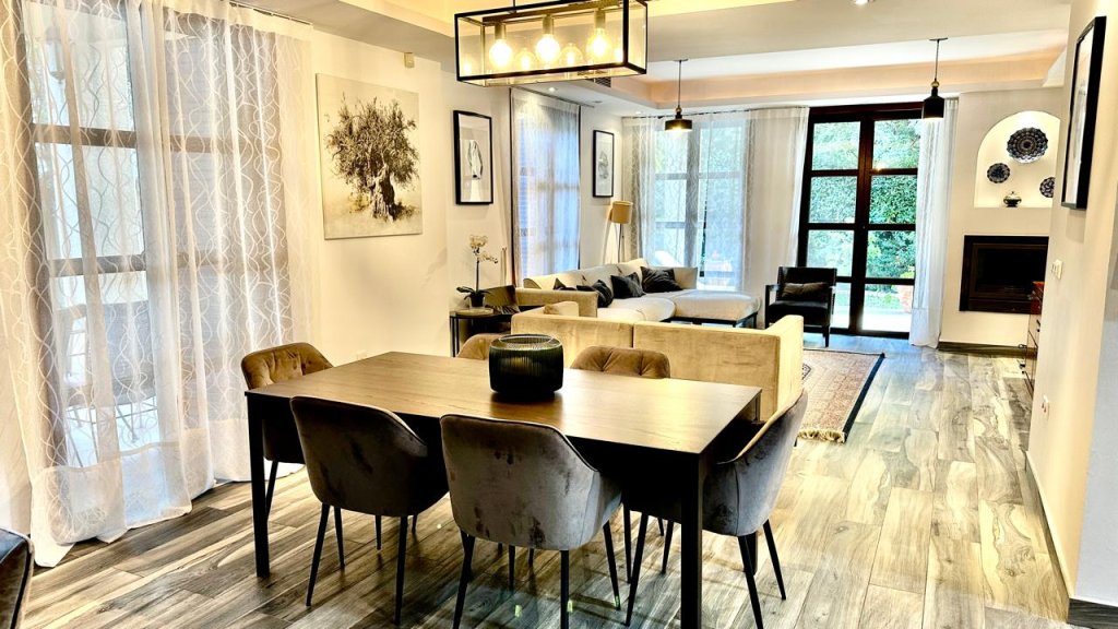 The villa itself is warm and inviting, featuring four bedrooms plus a study, three bathrooms, a cozy fireplace, and underfloor heating throughout. It is beautifully furnished and includes a lovely private fruit garden that adds an extra touch of comfort and character.