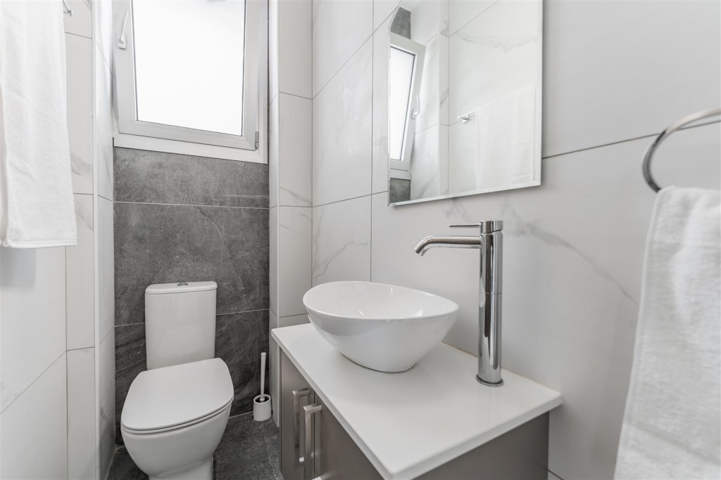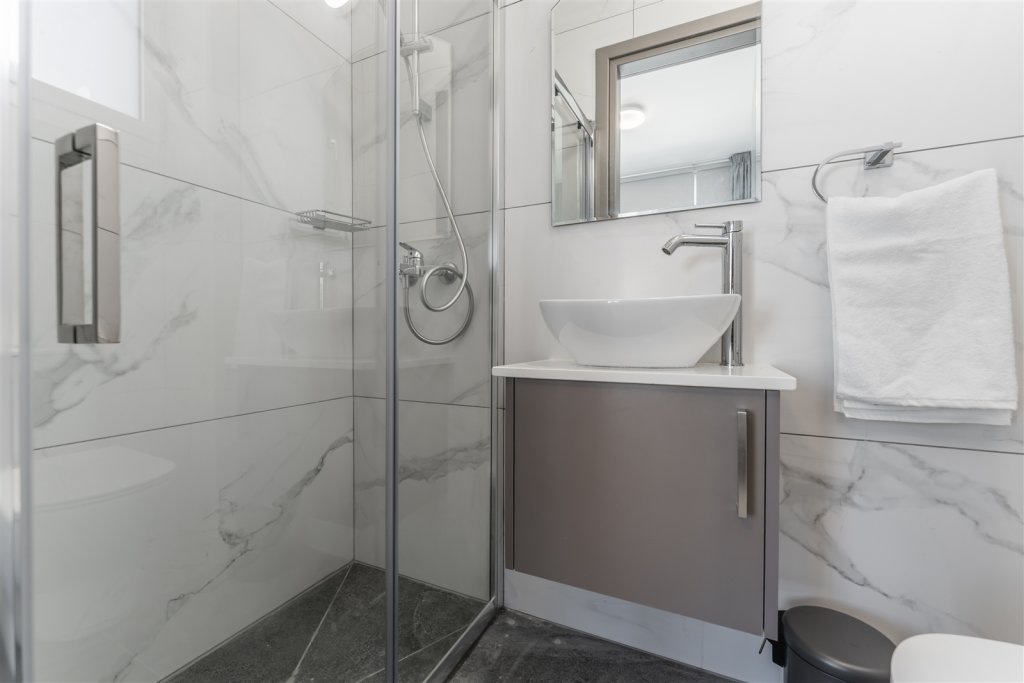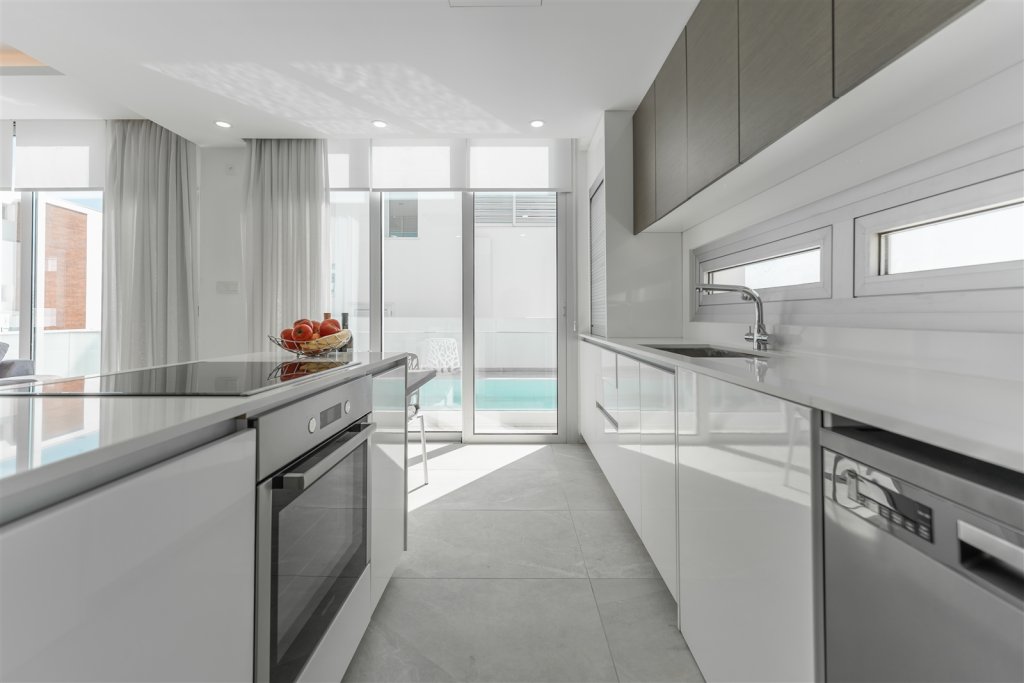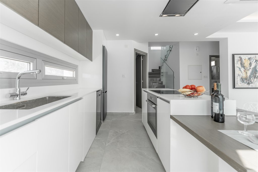 The ground floor welcomes residents into an open-plan living and dining area, seamlessly connected to a designer kitchen with a central island and access to the private garden and pool. A guest suite with an en-suite bathroom and independent access offers both comfort and flexibility, perfect for visitors or extended family.