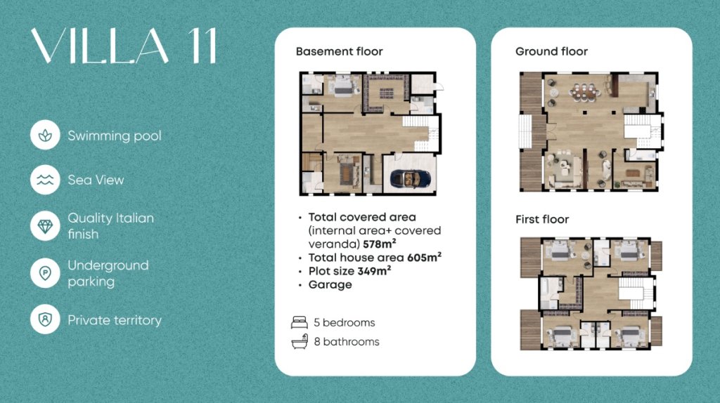 This exceptional five-bedroom villa offers over 580 m² of interior space across three levels, including a full basement and private garage. Positioned on a generous plot, it features panoramic sea views and elegant design touches inspired by Italian heritage—arched windows, stone facades, and terracotta rooflines.