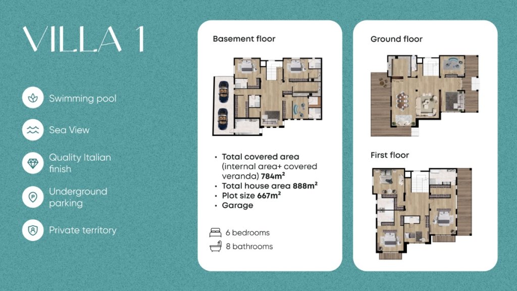 This magnificent six-bedroom villa is the largest residence in the community, positioned directly on the seafront with uninterrupted views of the Mediterranean. Spanning nearly 900 m² of total area, it offers unrivaled space, sophistication, and privacy.