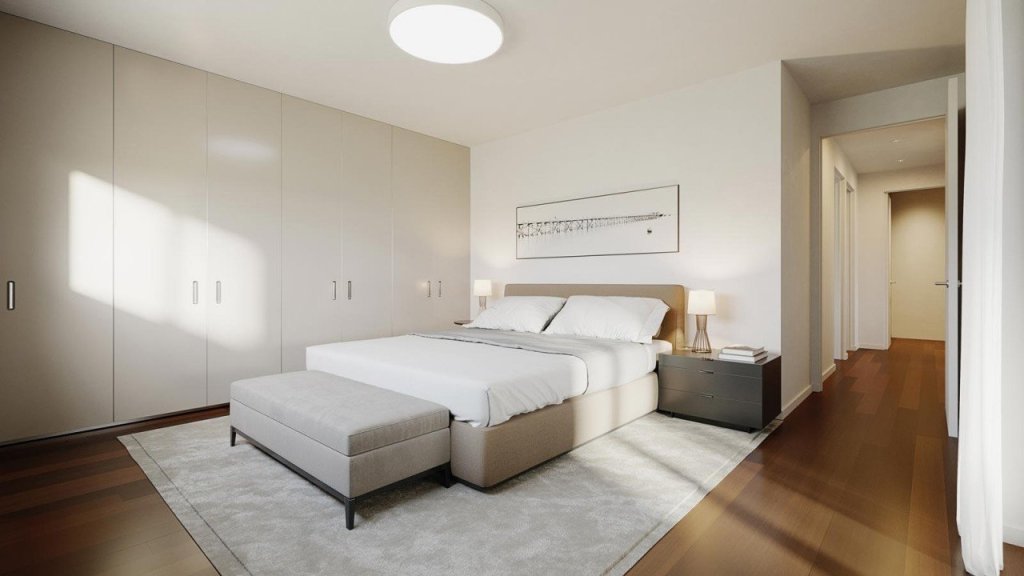 Each flat includes one or two covered parking spaces with an electric charge station provision and a spacious storage room in the basement. A large terrace garden with an exceptional view complements the fifth-floor penthouse.